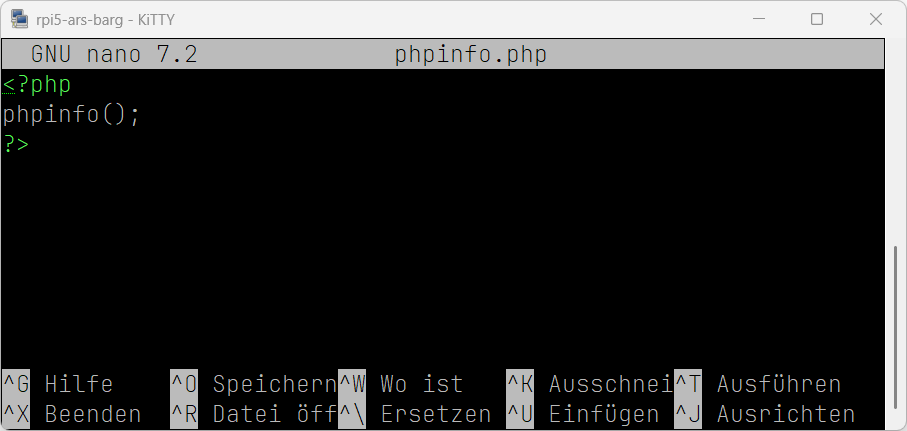 sudo nano phpinfo.phpund fügen folgenden Text ein: